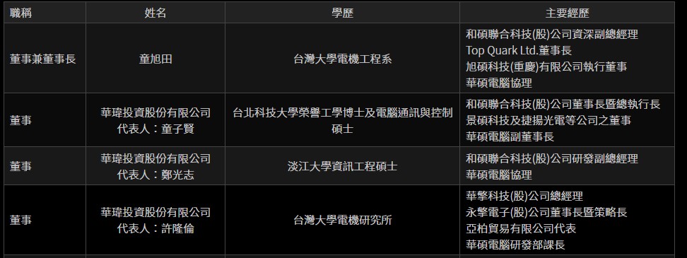 4.觀察其經營層發現總經理是台大電機研究所畢業。其他董事都是來至華碩電腦,這幫經營層也是相對讓人安心。