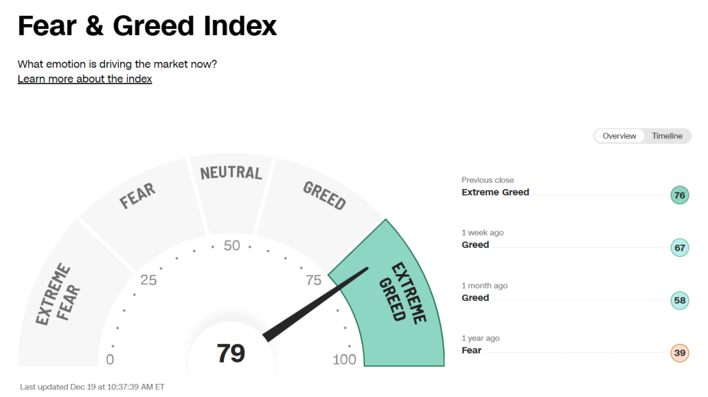 (1)美股投資的貪婪與恐懼指數來到了極度貪婪的區間,貪婪帶動股市成長,股價漲多了還是要回來。不建議在此多買進。而且這時候真的特別吊人胃口,會忍不住想買。
