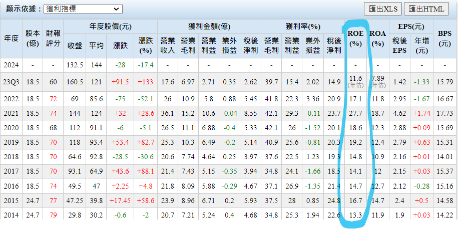 (4)由下圖可以看到全新這家公司的股東權益報酬率已經好多年維持在15%以上、資產報酬率也都有10%以上,可以說是一間經營優等的公司。