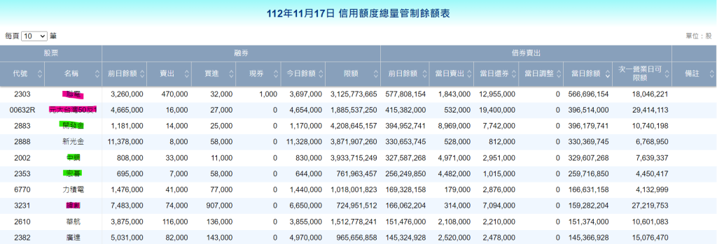 4.下圖為借券賣出餘額前幾名,紅紫色標記的是有減少賣出的、綠色是賣出增加的。都是可以留意的個股。(但是聯電還是餘額很高)資料來源於台灣證券交易所
