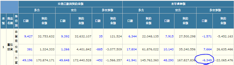 從下表台灣期貨交易所的資料中可以看到,外資未平倉餘額為負數通常就是覺得股票會跌、正數就代表他們覺得股票會漲。而自營商意思也差不多,但因為自營商錢比外資少一些,我不太會注意。