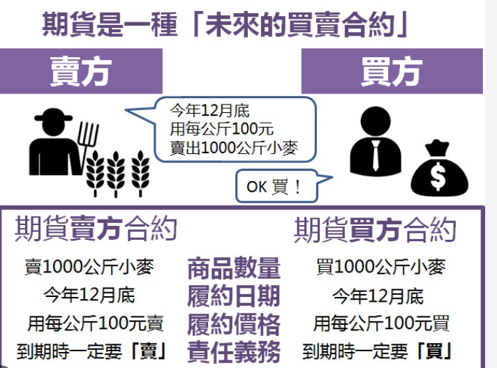 中間商:好的,那我們來簽屬合約,三個月後我用一斤100元跟你購買。但如果收成不好導致市場的價格其實是120元時,你也必須用100元賣給我哦。