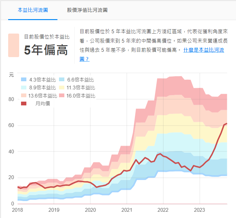 4.本益比河流圖與淨值比都在高檔的地方,如果公司是做AI的產品,也許可以拉高為16倍本益比,也就是大概在84元的位置。但也因為都在高檔了,追高風險就較高。(資料來源於財報狗)