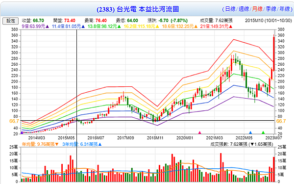 買進台光電後,股票隨著市場在說消費性電子沒有救了,載板要延後復甦,所以台光電就開始跌,跌到了150元/股。而救星就是公司法說會,公司說預計今年會逐季成長,所以股價就開始反彈,彈到了210元/股,稍作休息後又漲到了250元/股,回檔到230元(20日均線)後就開始飆漲到260元/股,然後藉著AI新聞話題,一路漲到了350元/股。而非常可惜的是我在本益比河流圖的高檔位置260~270就賣出了持股。